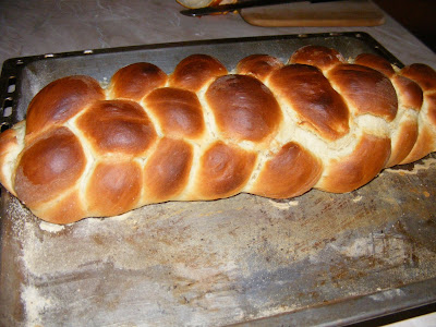 A gépbe a hozzávalókat a fenti sorrendben berakom. Dagasztás programot (1ó50p) indítok. Amikor lejárt a program, kiveszem, és megfonom. Én 6 részre osztom és úgy fonom, de lehet hármasban is, ha valakinek csak az megy. Fonás után tejjel lekenem, és vajazott- lisztezett tepsin, 175 fokos sütőben, egy vízzel teli tál mellett 30 percig sütöm.